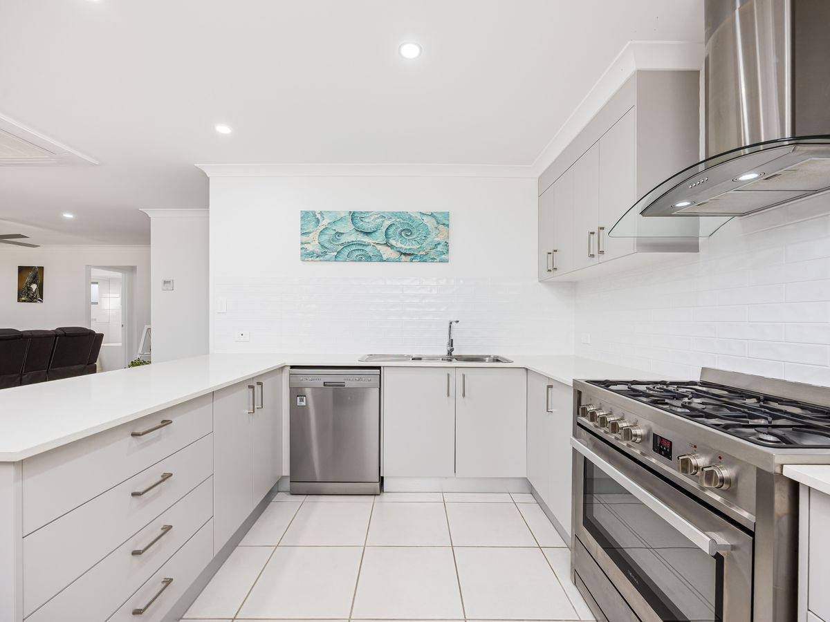 • 900mm freestanding oven, gas cooktop, canopy rangehood and dishwasher.
